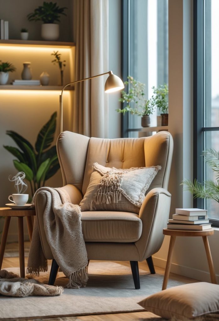 Create a small reading nook by placing a comfy chair in a quiet corner. Use soft pillows and a warm throw to make it inviting.
