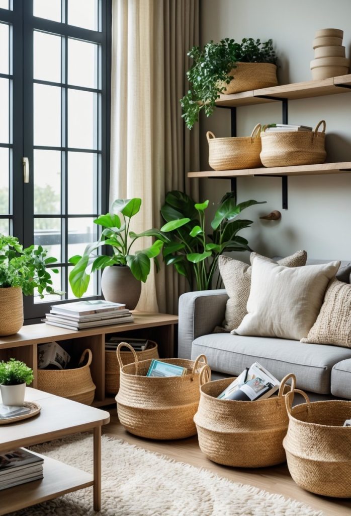 You can use woven baskets to keep your space tidy while adding charm. They work great for holding blankets, shoes, or craft supplies.