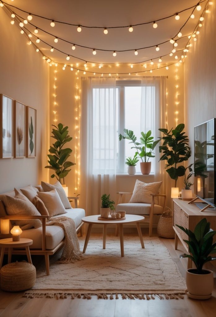 You can easily add warmth to your apartment with string lights. Hang them on walls, windows, or around furniture to create a gentle glow.