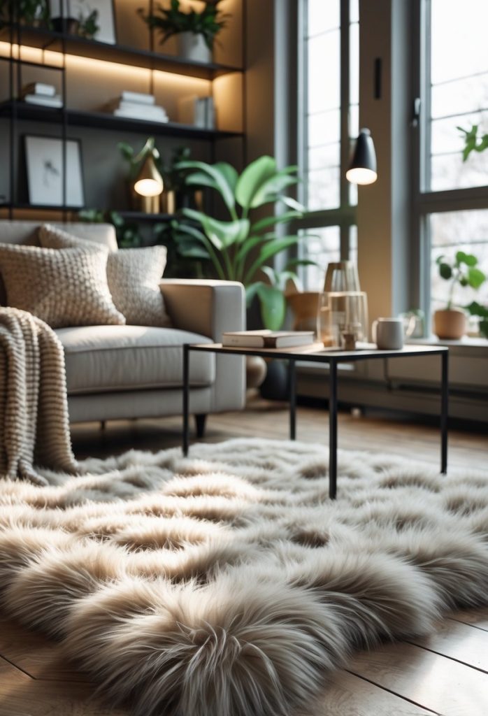A faux fur rug adds soft texture that makes your space feel warm and inviting. It’s perfect for creating a cozy spot in your living room or bedroom.