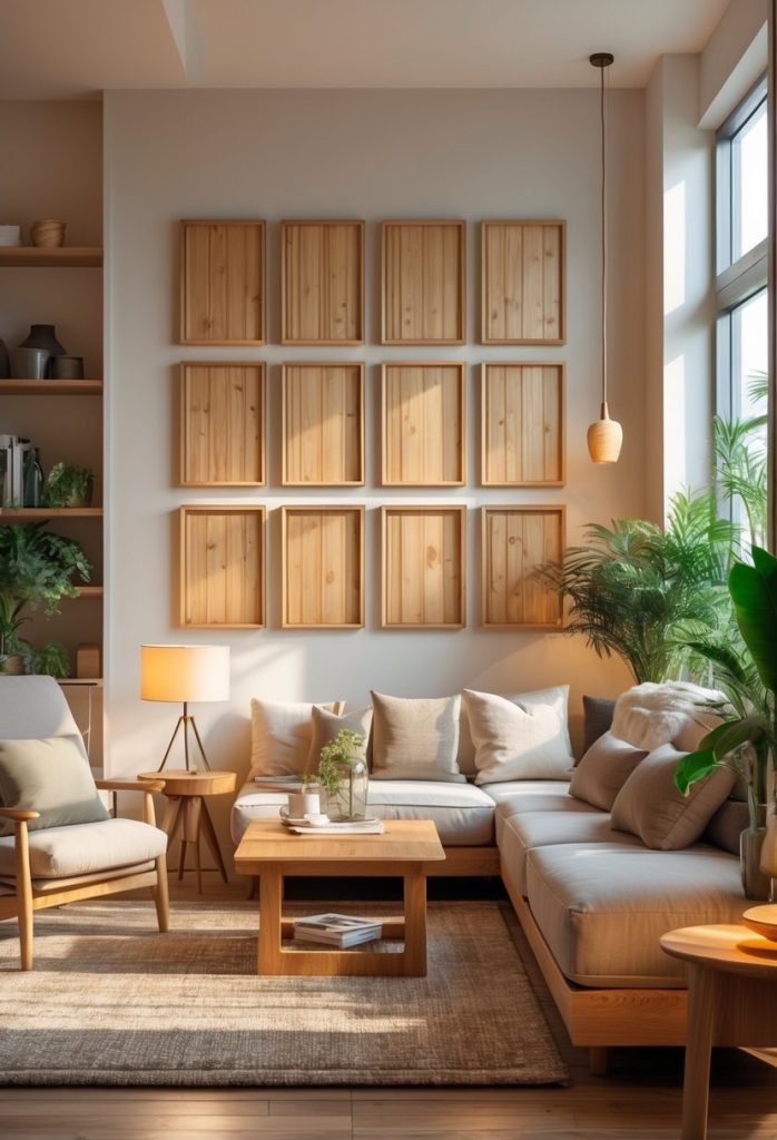 You can add a cozy touch to your apartment with warm-toned wooden picture frames. They bring natural texture and a soft, inviting feel to your walls.