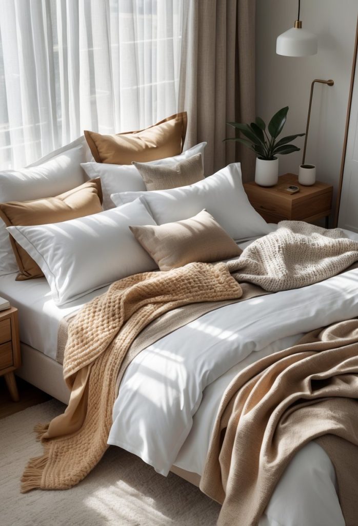 You can make your bed feel cozy by layering different blankets and throws. Start with soft sheets, then add a lightweight throw or a chunky knit blanket at the foot of the bed.