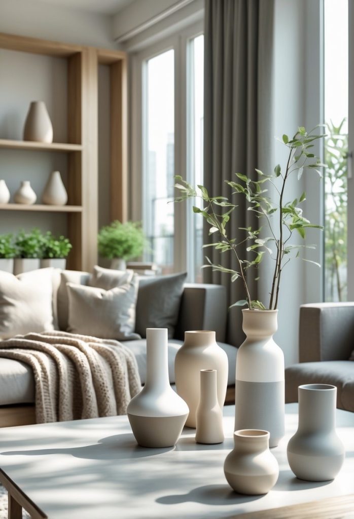 You can add a simple, clean touch to your apartment with minimalist pottery and vases. Choose pieces with smooth shapes and neutral colors to keep your space calm and open.
