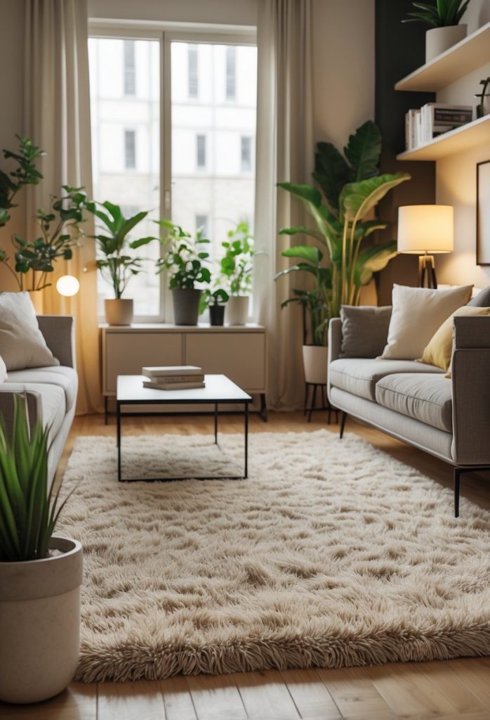 A soft, plush area rug can help you separate different parts of your apartment, like your living and dining areas. It adds comfort under your feet, making the space feel warmer. Choose a rug with a texture or color that matches your style to pull the room together and create a cozy vibe.
