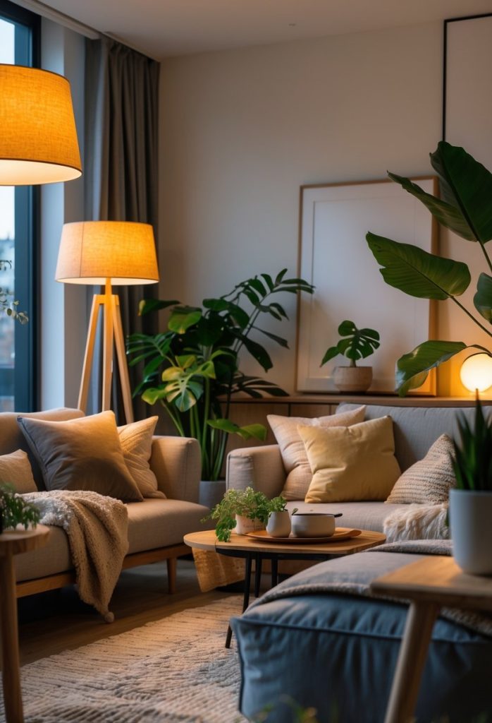 You can add warmth to your apartment by using floor lamps with fabric shades. The soft light they give off creates a cozy and inviting feel.