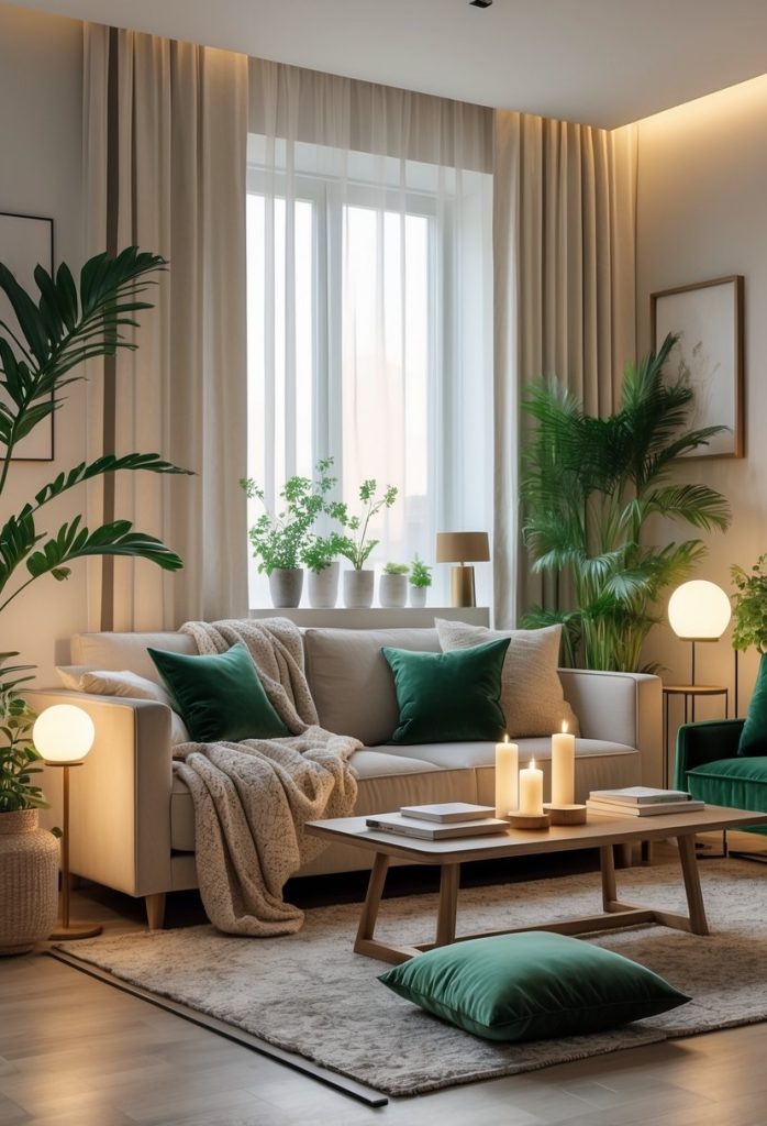 Adding deep green accents brings life and a natural touch. Think pillows, plants, or a green rug to make your space feel fresh and balanced. This mix keeps your home modern and peaceful.
