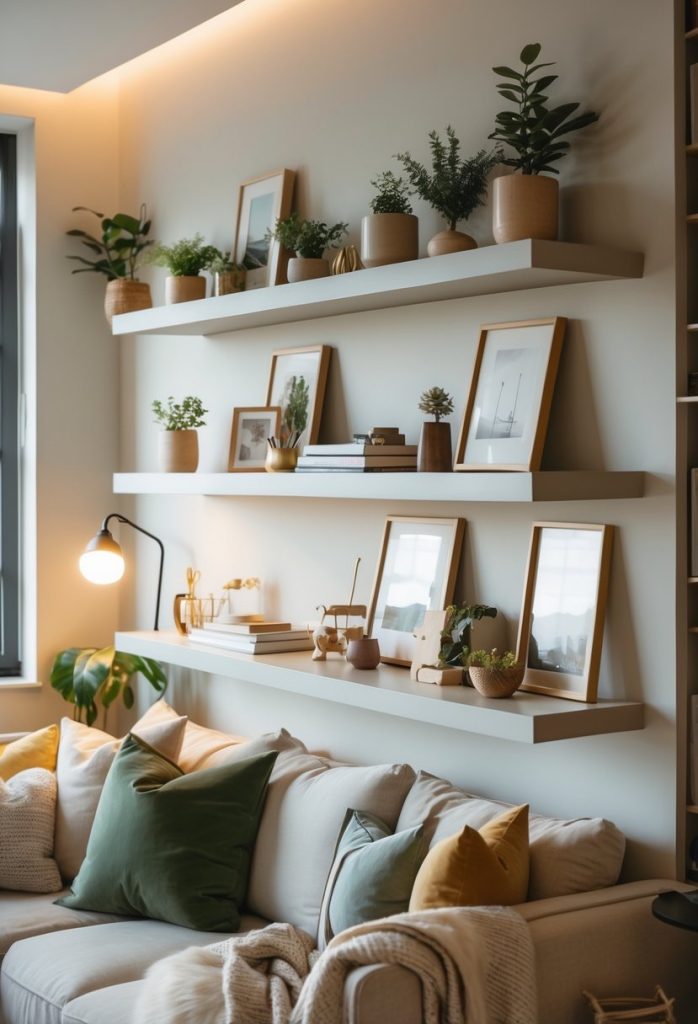 You can use floating shelves to save space and add style to your apartment. They hold books, plants, or photos without taking up floor space.