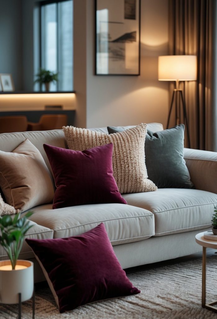 You can add warmth and style to your apartment with velvet or chenille throw pillows. Velvet pillows have a soft, shiny surface that changes color in the light, making your space feel cozy and elegant.