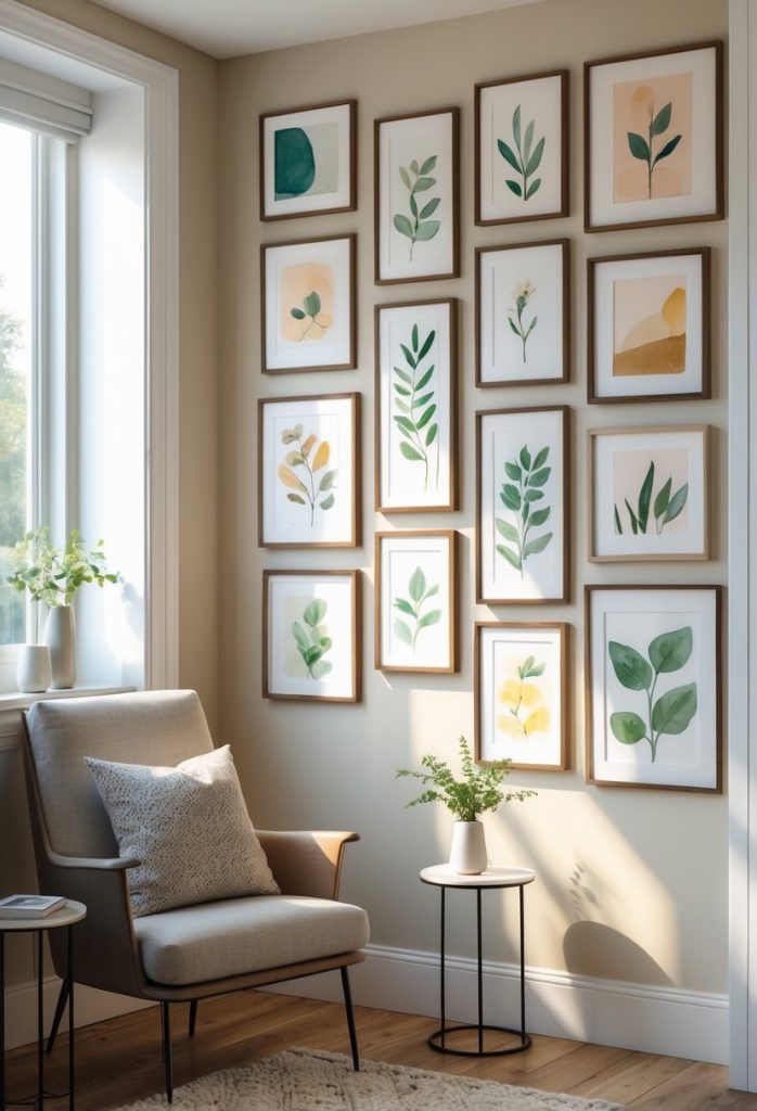You can brighten your small room by hanging a gallery wall with several small art pieces. This adds character without taking up space.