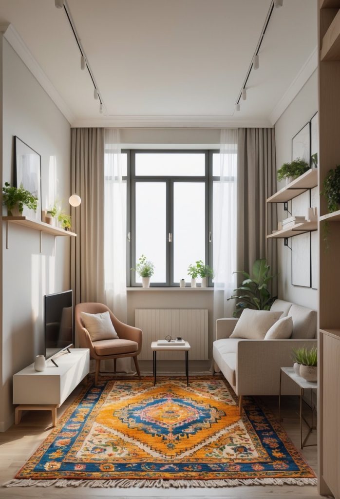 Choose a rug with a bright color or interesting pattern that matches your style. Placing it in the center of the room helps anchor your furniture and adds personality without taking up space.