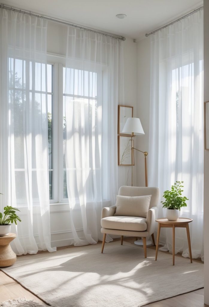 Choose light colors and hang the curtains high and wide to make your windows look bigger. This adds a sense of height and space without extra effort. Sheer curtains also create a soft, airy feel that freshens up any room.