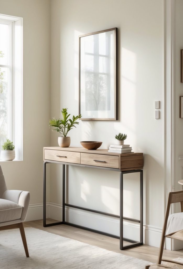 A slim console table fits perfectly in small rooms without taking up much space. You can place it against a wall or behind a couch to add extra storage and display areas.