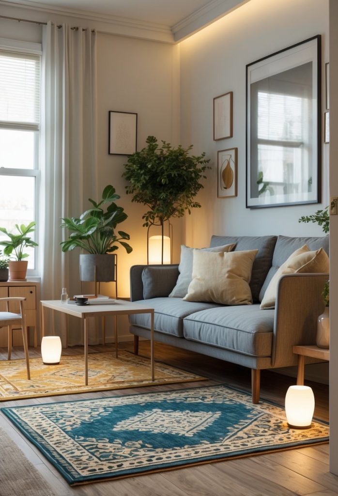 You can add warmth and style by layering rugs in your small room. Start with a larger base rug, then place a smaller one on top, mixing patterns or textures. This gives your space a cozy feel and adds interest without taking up extra room. Overlapping rugs on the sides can help define different areas in an open space.