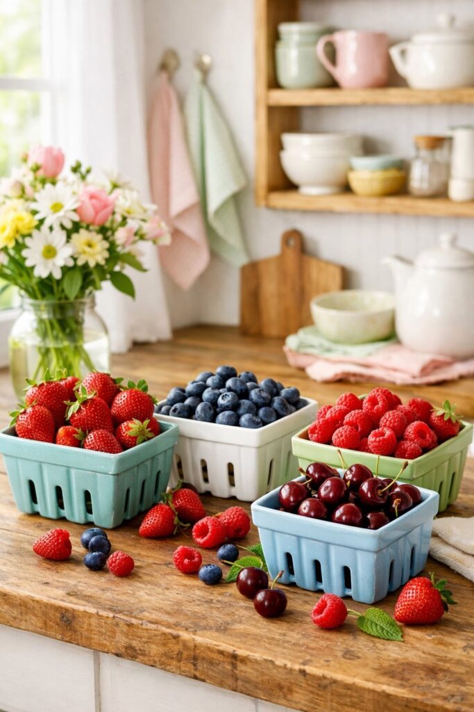 White ceramic berry baskets give your kitchen a clean, classic look. If you want something bolder, turquoise options add a fun pop of color that fits the spring vibe. You can find ceramic berry basket sets on Amazon in different colors and sizes to match your kitchen style.