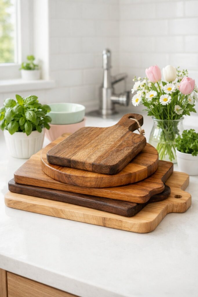 Stack the boards so they overlap slightly, with taller ones in back and smaller ones in front. This layered look gives your kitchen a relaxed, lived-in feel that’s perfect for spring. Switch out your boards seasonally or whenever you want a quick style update.