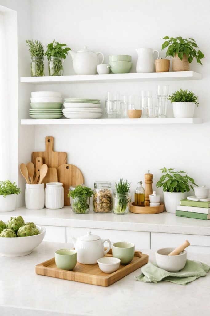 Stick to white dishes only. This creates a calm base that makes your shelves feel organized instead of messy. White plates, bowls, and serving pieces all work together without competing for attention.