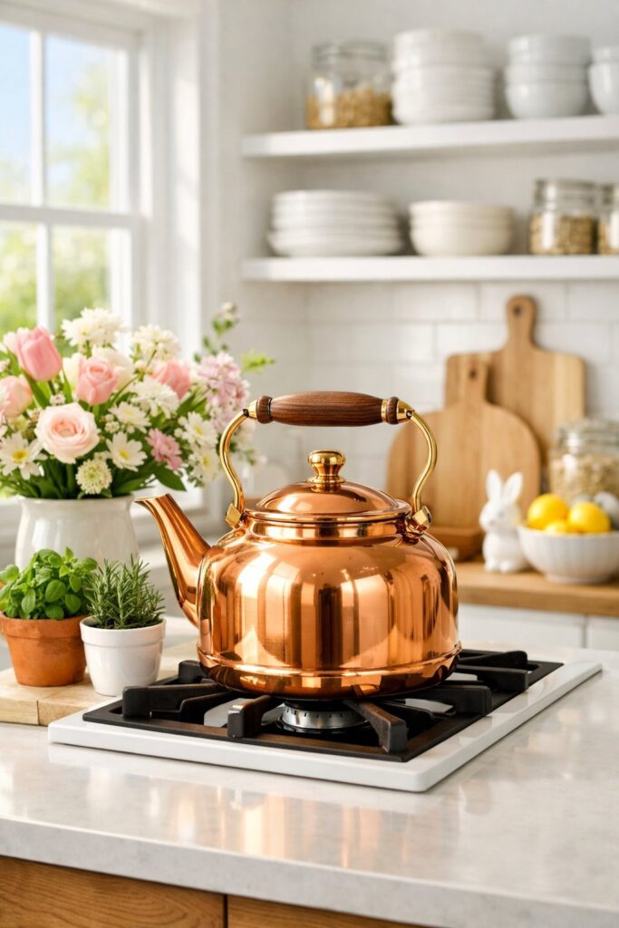 Copper brings warmth to your kitchen and pairs beautifully with spring colors like soft greens and blush pinks. The metal’s natural shine catches the light and adds a welcoming glow to your cooking space.