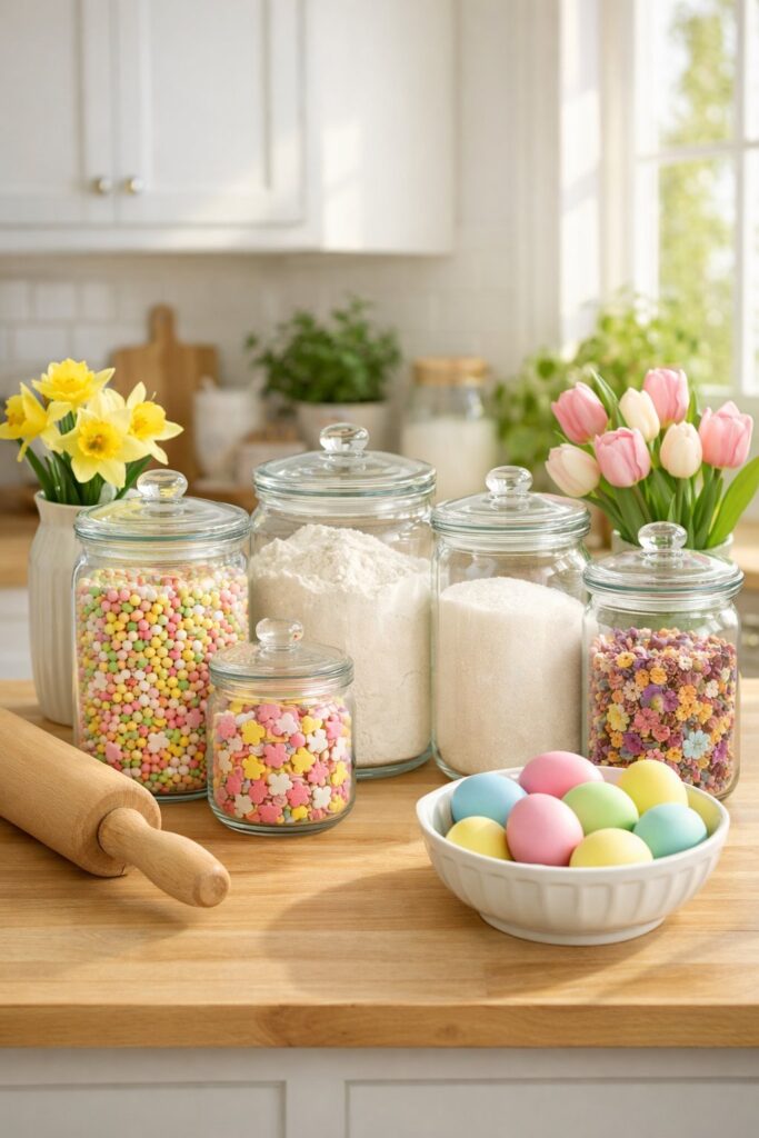 Glass jars turn your baking supplies into kitchen decor. Fill large containers with flour, sugar, or colorful spring-themed pasta for a display that’s both pretty and practical.