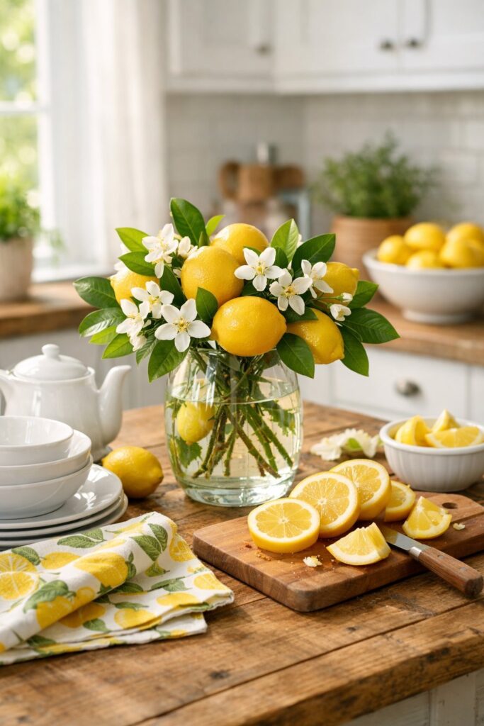 Lemons scream clean and fresh, making them perfect for spring. A lemon kitchen decor vignette adds instant brightness to your space without a major commitment.