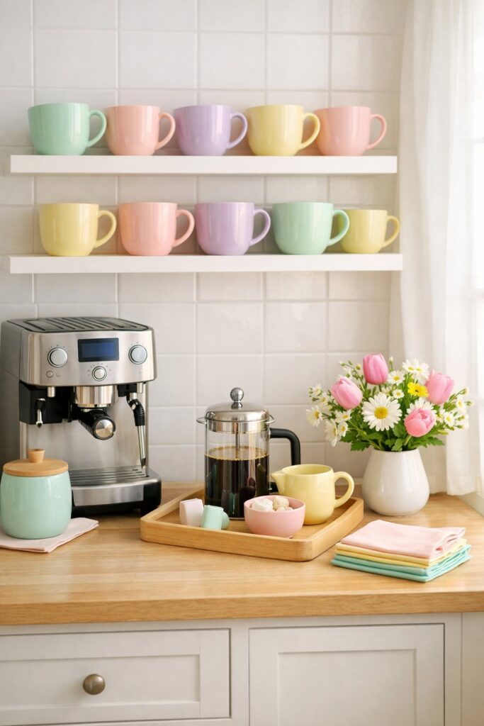 Your coffee bar deserves a spring makeover. Start by swapping out your dark winter mugs for lighter pastel versions in soft pink, blue, or mint green.