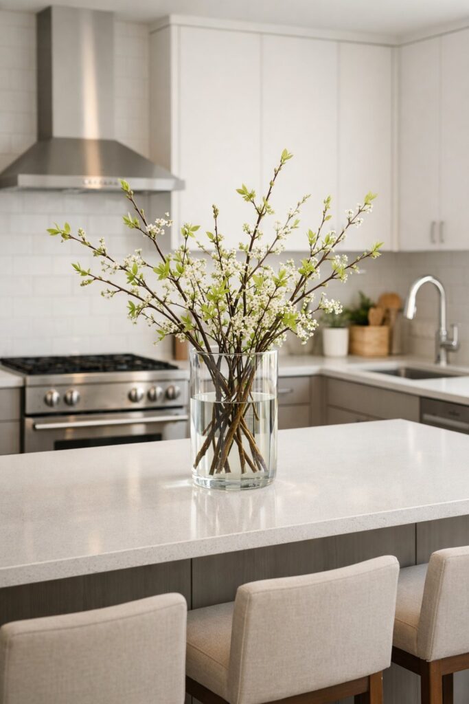 Cherry blossom or quince branches work perfectly for this look. The key is choosing branches that are tall enough to make a statement on your island. You want them to draw the eye upward and fill the space nicely.