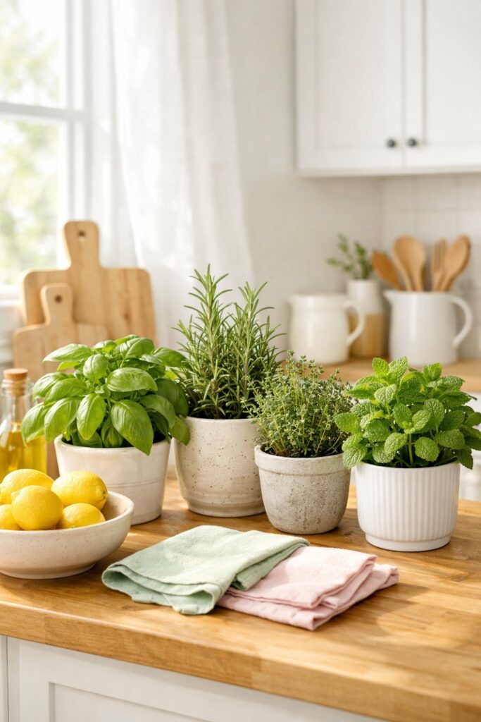 Pick three small potted herbs like basil, mint, and rosemary. Set them on your kitchen windowsill where they can catch sunlight. You can also place them on your island for easy access while you cook.