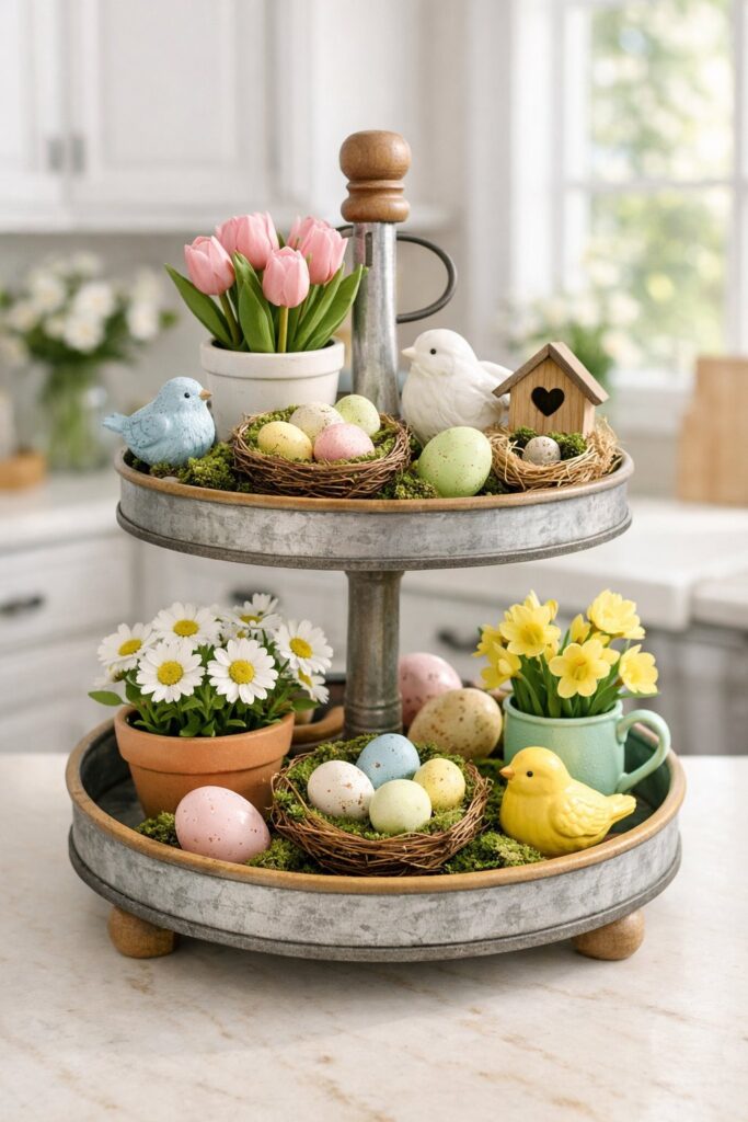 Start with a rustic wood tiered tray as your base. Fill the levels with mini spring signs that say “Hello Spring” or other cheerful messages. Add small mugs in pastel colors or floral patterns to give your display a cozy feel.