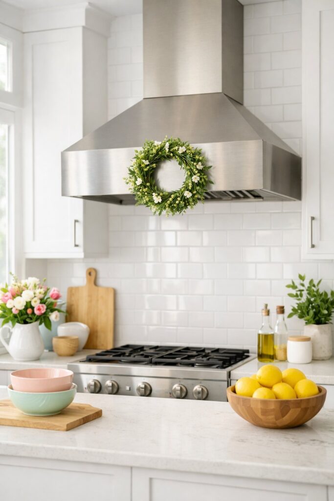 Your range hood is prime real estate for spring decor. A small wreath adds a charming focal point right at eye level while you cook.