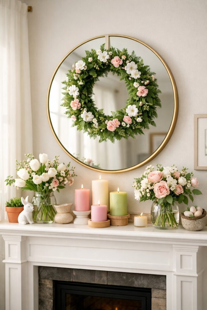 The mirror adds depth while the wreath brings that fresh spring vibe. Gold pivot mirrors work especially well for this look. They catch the light and create an elegant backdrop for your greenery.