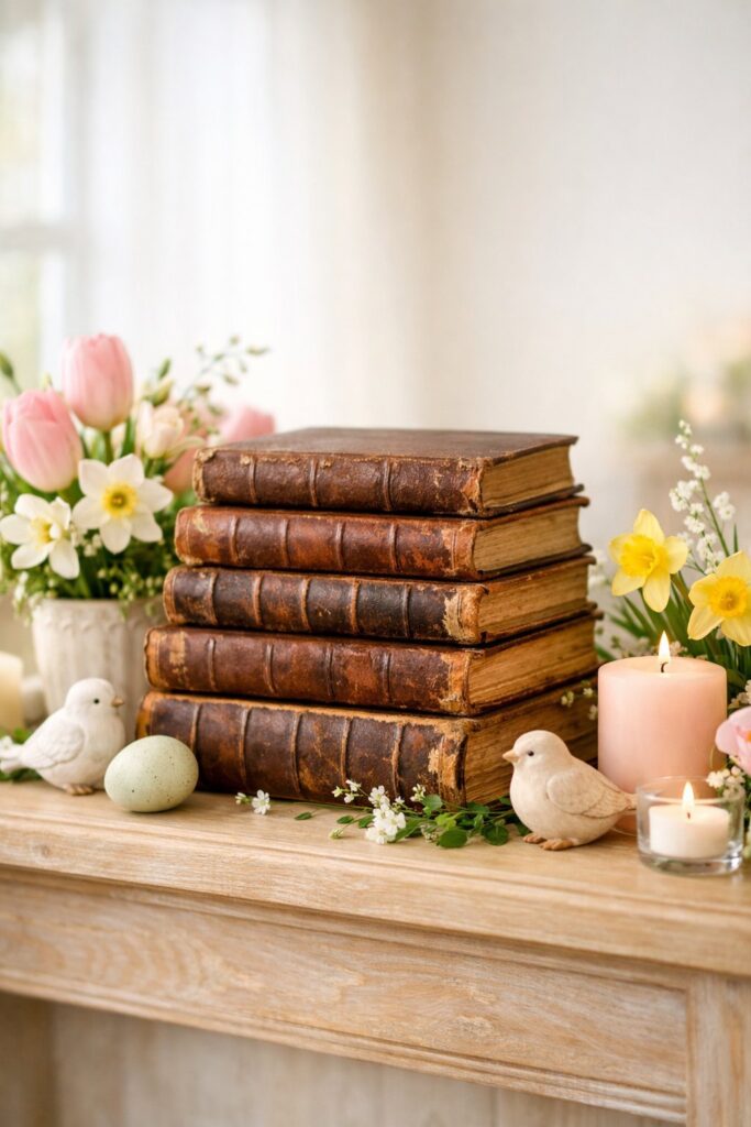 Look for books with neutral or faded covers that match your spring color scheme. Stack two or three books together to get the right height for each item.