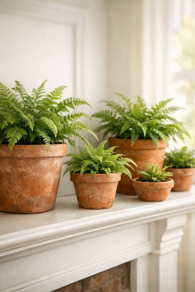 Bring the garden indoors by placing aged terracotta pots along your mantel. Fill them with maidenhair ferns or other leafy varieties for a natural look. The earthy orange tones of the pots pair well with the soft green of the ferns.