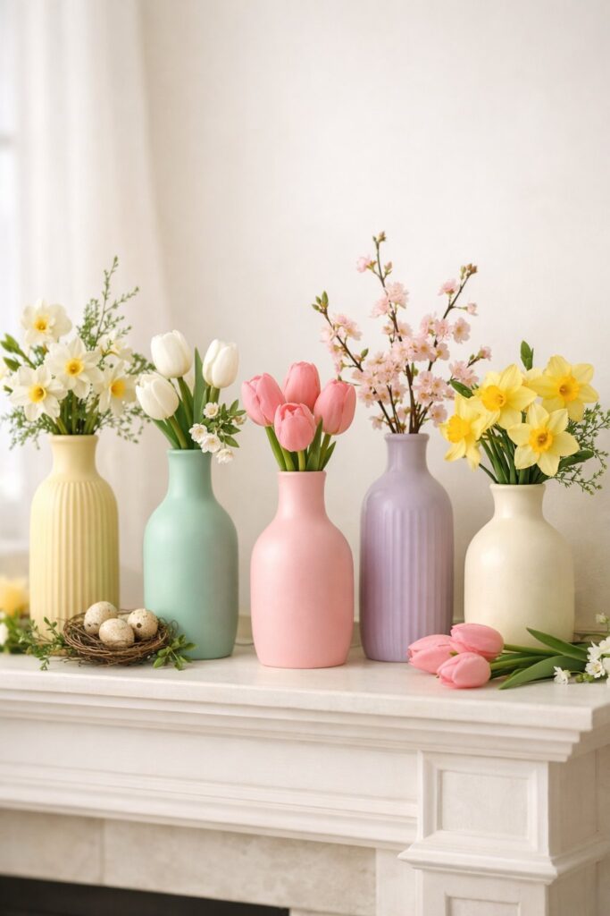 Group three to five glass bud vases in soft colors like pale blue, mint green, or blush pink. You can mix different bottle shapes and sizes to add visual interest.