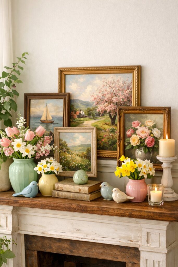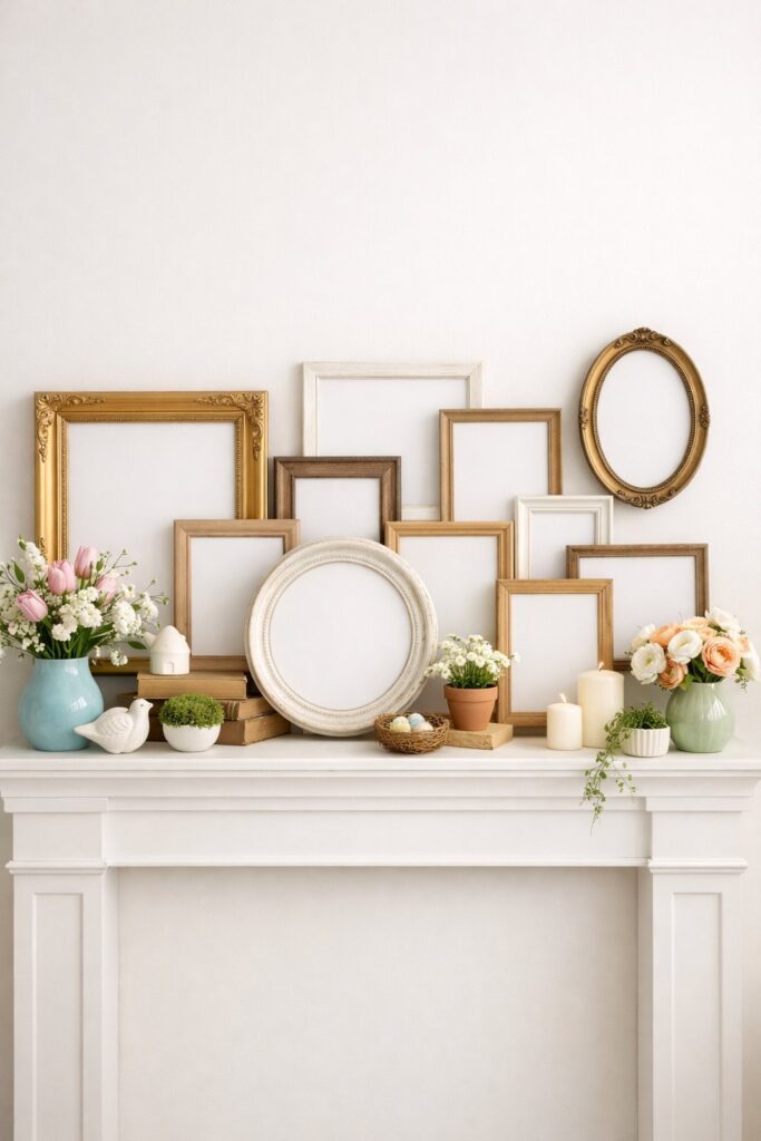 This approach works great for simple spring mantel decor that feels fresh and uncluttered. You can choose frames in soft white, cream, or natural wood tones to match the season. Mix ornate vintage frames with simpler styles for visual contrast.
