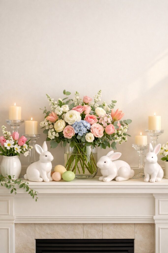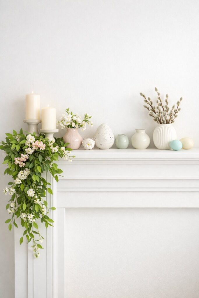These easter mantel ideas work especially well if you want to acknowledge the holiday without completely redecorating. Your mantel stays sophisticated while still feeling festive and welcoming.