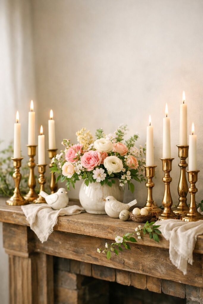 Brass candlesticks bring warmth and shine to your spring mantel. They’re perfect for a rustic spring mantel when you want that cozy vintage feel.
