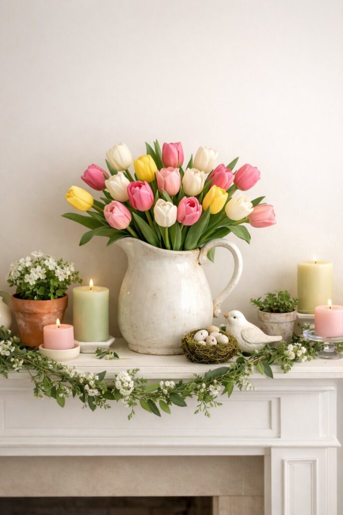 A white ceramic pitcher filled with tulips makes a perfect spring mantel decoration. You don’t need anything fancy or complicated.