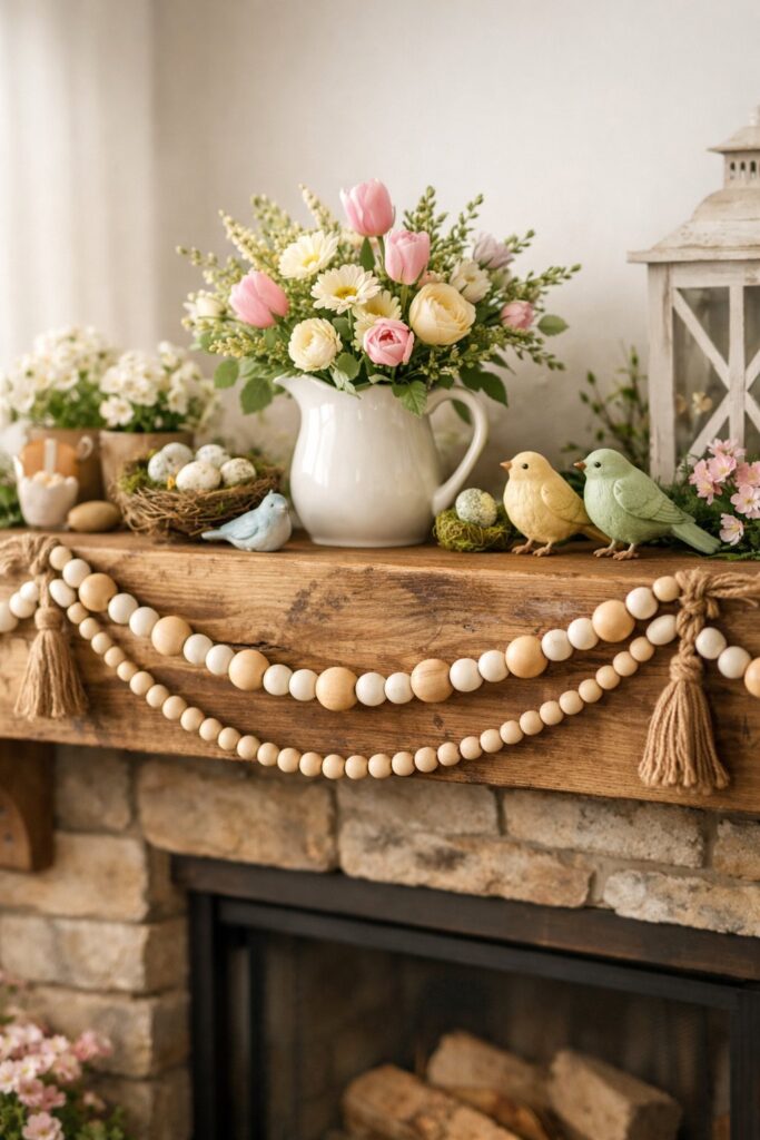 Wooden bead garlands bring instant warmth to your spring mantel with their natural texture and neutral tones. You can drape them loosely across the length of your mantel for a relaxed, casual look. The beads work perfectly with other spring decor because they complement soft pastels and fresh greenery without competing for attention.