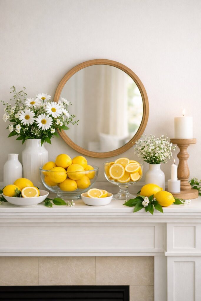 Lemons bring a bright, sunny vibe to your spring mantel. The cheerful yellow color adds energy without relying on traditional pastels.